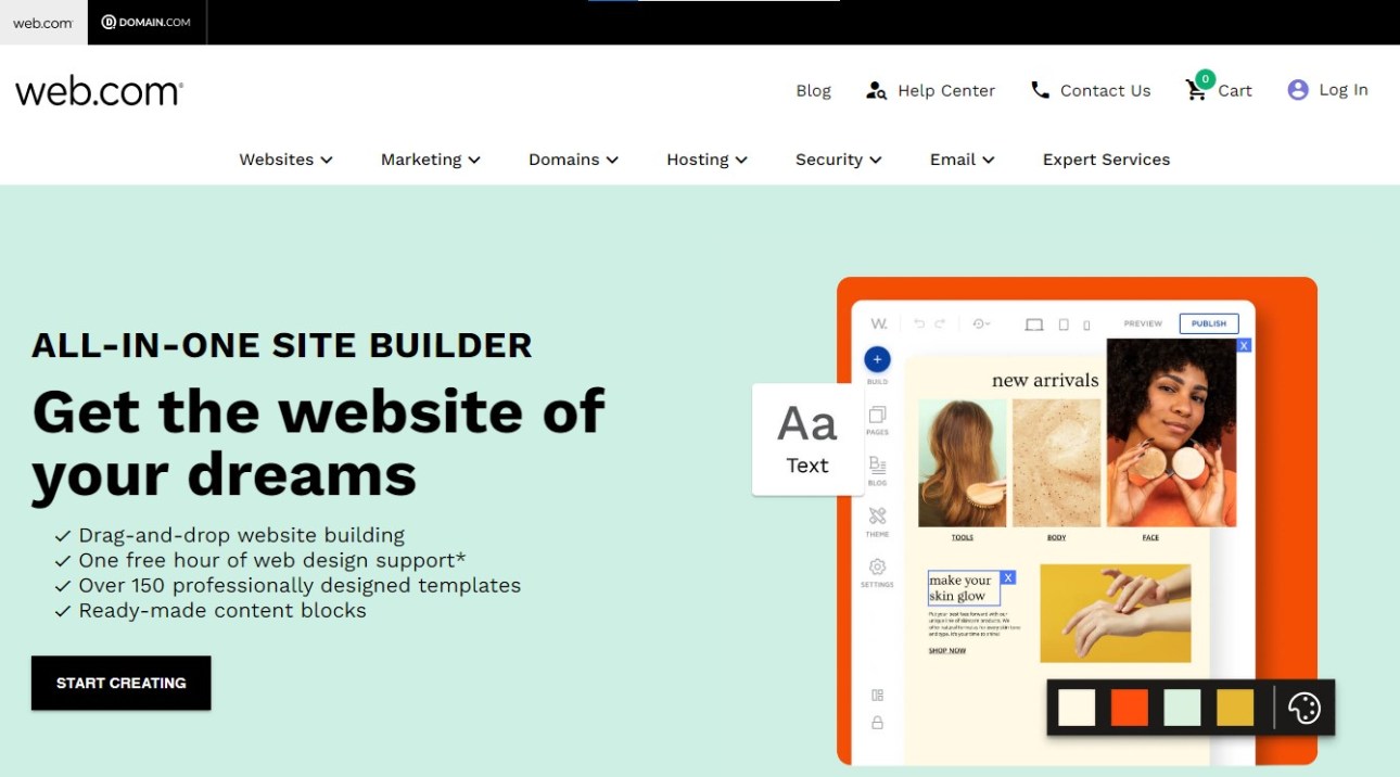 Web.com is the perfect platform for small businesses looking to get started with a website. During our testing, we found Web.com to be user-friendly and the lowest priced choice for starting an online presence. It makes website building uncomplicated, enabling anyone to create a functional and good-looking site with their intuitive drag-and-drop editor without needing any technical knowledge.